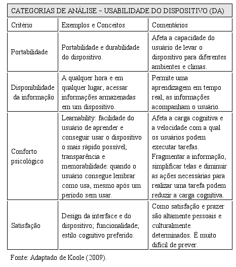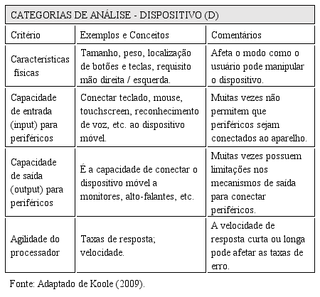 A Usabilidade do Dispositivo relaciona as características dos dispositivos móveis para tarefas cognitivas com a manipulação e armazenamento de informações (quadro 4).