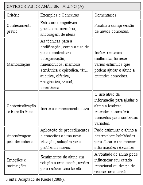 O Aspecto Aluno (A) leva em conta as habilidades cognitivas do indivíduo, a memória, o conhecimento prévio, as emoções e as motivações possíveis (quadro 2).