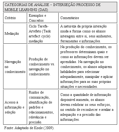 KOOLE, M. L. A Model for Framing Mobile Learning. In: Mobile learning: transforming the delivery of education and training. AU Press, Athabasca University, p.25-47, 2009.