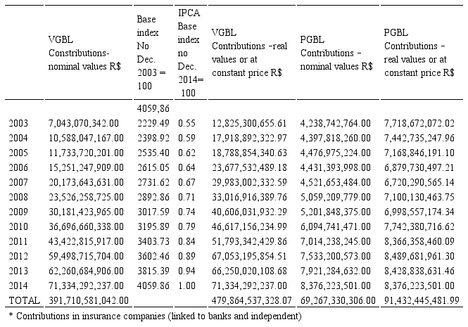 Analysing the total value of contributions (VGBL + PGBL) in the period from 2003 to 2014 (Table 5), it was found that this presented sporadic reductions. Negative percentage variations were observed in the volume of contributions from one year in relation to the previous year in the years 2005, 2011, 2012 and 2013. In these years the reductions were of 12, 26.2, 0.6 and 7.3%, respectively.