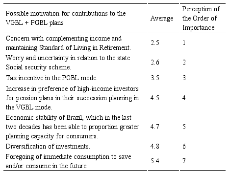 The brokers were requested to list in order of importance from one (the most important) to seven (the least important), without repeating a number, the possible motivations for contributions to the VGBL and PGBL mode pension plans. To analyse the data obtained in the replies to this question, the average of the degree of importance given by all the participants in each question was generated. The average of each question was classified in ascending order of importance to obtain the ordering in degree of importance, shown in Table 2.
