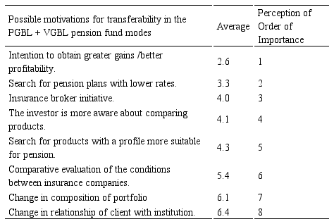Based on the generation of the average of the importance in the replies of each one of the possible motivations for the transferability in the VGBL and PGBL pension plan modes, we arrived at the perception of an order in importance shown in Table 03.