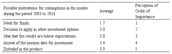 Analysing the replies relative to possible motivations for redemptions in the two modes in the period 2003 to 2014, the order of importance is shown in Table 04.