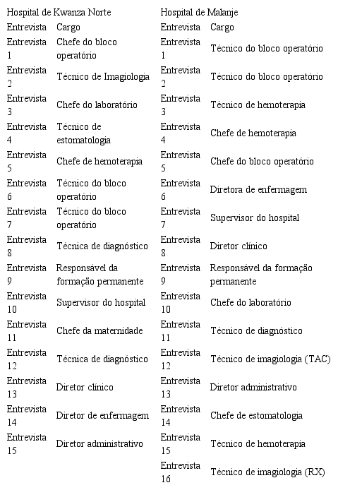 Para este estudo, foram usadas entrevistas em profundidade, observação direta e indireta, documentos e arquivos, bem como notas de campo como instrumentos de coleta de dados. O roteiro de entrevistas foi elaborado a partir da literatura sobre os principais fatores que afetam a transferência de conhecimentos. As entrevistas foram efetuadas com os gestores dos hospitais selecionados, responsáveis pela compra dos equipamentos, com os chefes de seções e os técnicos por serem os operadores diretos e responsáveis pela manutenção dos equipamentos. Para o primeiro caso, foram realizadas 15 (quinze) entrevistas em profundidade, sendo três feitas com os membros de direção do hospital, seis com os chefes de seções e as demais seis com os técnicos das diferentes seções (Quadro 1). O tempo médio de cada entrevista foi de 45 minutos, gerando mais de trinta páginas de transcrição. Os respondentes foram selecionados de acordo com sua relevância na estrutura organizacional e criticidade (MEYER, 2001), isto é, com indivíduos efetivamente relacionados com a utilização, gestão dos equipamentos e com o processo de transferência, detentores, portanto, de informações críticas para a compreensão do fenômeno e das variáveis que o afetam. No segundo caso, Hospital de Malanje, foram realizadas 16 (dezesseis) entrevistas, sendo três com membros de direção do hospital, seis como os chefes de seção e sete com os funcionários das diferentes áreas do hospital (Quadro 1). O tempo médio de cada entrevista foi de 45 minutos, tendo gerado aproximadamente quarenta páginas de transcrição. Os critérios de seleção de entrevistados foram os mesmos utilizados no primeiro caso (MEYER, 2001).