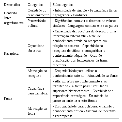 No âmbito da receptora, dois fatores são especialmente importantes: a capacidade de absorção e a motivação para aprender. A capacidade absortiva do receptor diz respeito à capacidade de reconhecer o valor dos novos conhecimentos, bem como absorver, explorar e utilizar o referido conhecimento (COHEN; LEVINTHAL, 1990; VINDING, 2000; EASTERBY-SMITH et al., 2008). Vários estudos descrevem a capacidade de absorção a partir do resgate do conceito de Cohen e Levinthal (1989: 569-570) no qual a capacidade de absorção é concebida como “[...] a capacidade da empresa em identificar, assimilar e explorar o conhecimento do ambiente [...]” (ver, por exemplo, ZAHRA; GEORGE, 2002; EASTERBY-SMITH et al., 2008).