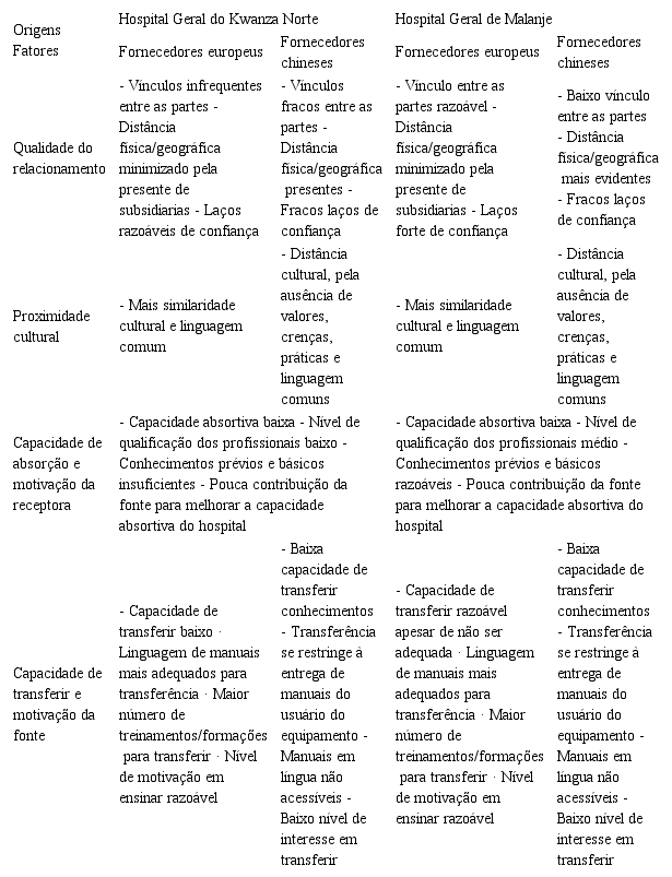 Desse modo, é possível constatar algumas semelhanças e divergências entre os fatores mais relevantes para o processo de transferência de conhecimento nos dois casos (Hospital Geral do Kwanza Norte e Hospital Geral de Malanje). Percebe-se que os principais fatores que afetam a transferência de conhecimento entre as empresas fornecedoras e os hospitais estudados são: (i) qualidade de relacionamento; (ii) proximidade cultural; (iii) capacidade para transferir; (iv) capacidade de absorção e (v) motivação. A seguir, são analisadas as implicações de cada um deles para o processo.