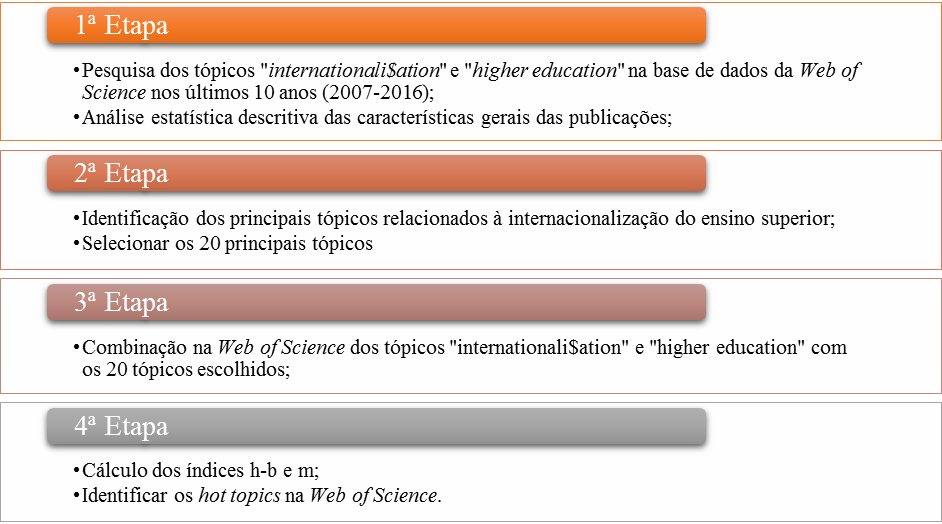 A presente pesquisa dividiu-se em quatro etapas. A primeira etapa consistiu em pesquisar como tópicos os termos “internationali$ation” e "higher education" na base de dados da Web of Science, definindo-se o período de 10 anos, a escolha deste período de análise pauta-se em estudos desenvolvidos que utilizaram o mesmo período de tempo para identificação de comportamento dos estudos de determinada área, como os estudos desenvolvidos por Dal-Soto, Alves e Souza (2016), Figueiró e Raufflet (2015) e Raasch et al. (2013). Desta maneira o período selecionado para o desenvolvimento desta análise compreende o intervalo de 2007 até 2016. Ressalta-se que na seleção da base de dados foi escolhida somente a principal coleção da Web of Science. Realizada a pesquisa inicial, foram identificadas as características gerais das publicações, tais como: ano das publicações, autores, países, instituições, idiomas, áreas de pesquisa e fontes de publicação.