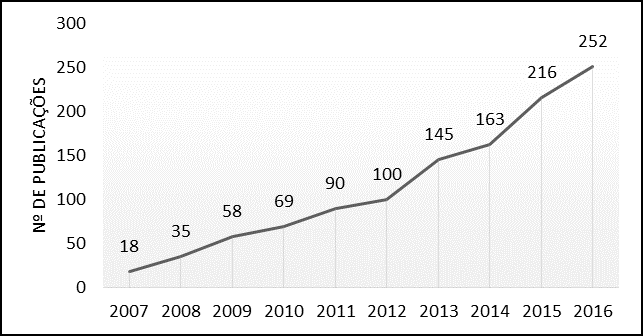 Analisando a produção científica dos estudos realizados sobre a internacionalização do ensino superior, no decorrer dos últimos 10 anos é possível notar, conforme visualizado no Gráfico 1, um crescimento gradual no número de publicações, sendo que no período 2007-2016 apresentou um crescimento médio de 36,36% ao ano, chegando a número de 252 publicações no ano de 2016, ano com o maior número de publicações. Desta maneira, é possível ratificar a importância que o tema tem recebido com o passar dos anos.