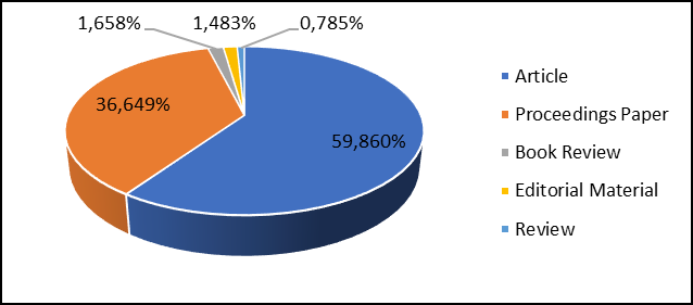 A maioria das publicações do período referem-se a artigos científicos, sendo que este tipo de documento representa aproximadamente 60% do total de publicações no período. Se considerarmos a soma dos artigos com os papers publicados, teremos quase a totalidade dos documentos publicados, sendo que a soma desses dois tipos de documentos representa 96,5% do total publicado.