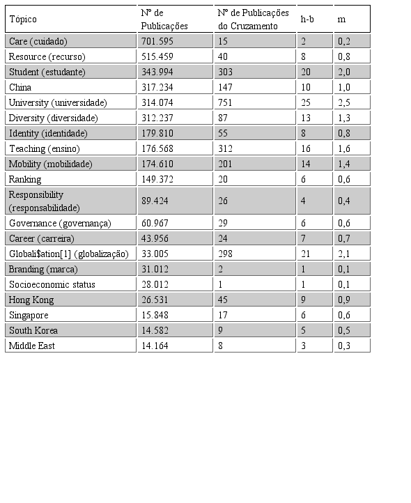 Posteriormente foi realizado o cruzamento de cada um dos 20 tópicos selecionados com os termos “internationali$ation” e “higher education”, salienta-se que foram utilizados os mesmos critérios da pesquisa inicial, pesquisa por tópicos, na base de dados principal da Web of Science e no período compreendido entre 2007-2016. A partir deste cruzamento foi possível determinar os índices h-b e m para cada tópico selecionado.