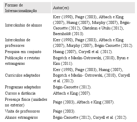 Os autores Borges e Amal (2016) realizaram um levantamento sobre as diversas maneiras em que pode ocorrer o processo de internacionalização das instituições de ensino superior. Deste estudo, os autores verificaram que existem 10 maneiras para uma instituição de ensino superior se internacionalizar, conforme exposto no quadro 1.