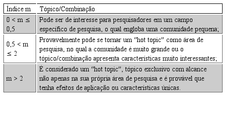 O quadro 2 apresenta a classificação do índice m e a relação com os hot topics de acordo com a classificação proposta por Banks (2006).