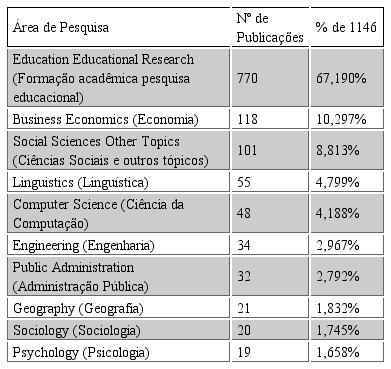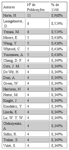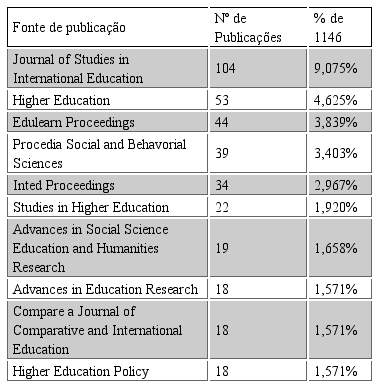 Encontrou-se ainda uma grande dispersão das publicações no que se refere aos autores, sendo que o principal autor (Hugo Horta) representa menos de 1% do total das publicações pesquisadas. O Journal of Studies in International Education foi encontrada como a principal fonte das publicações pesquisadas. A pesquisa educacional foi a área temática mais relevante para os resultados encontrados.