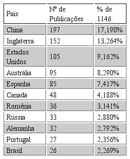 O quadro 4 representa as publicações de acordo com país onde foi realizado, foram demonstrados no quadro 4 os 10 principais países no que concerne ao número de publicações dos tópicos analisados, insere-se na tabela ainda o Brasil que ocupa a 11ª posição em número de publicações. Verifica-se uma predominância dos estudos realizados na China, com um total de 197 artigos, seguido pela Inglaterra e Estados Unidos com 152 e 102 publicações, respectivamente. O Brasil encontra-se na 11ª posição com um total de 26 publicações ou 2,269% do total de estudos publicados.