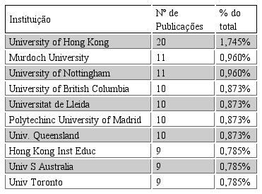 Ratificando a importância da China para os estudos de internacionalização do ensino superior, tem-se igualmente em primeiro lugar uma instituição chinesa com o maior número de publicações do período. A University of Hong Kong publicou 20 documentos durante o período informado.
