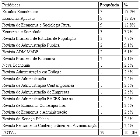 Vale ressaltar, além disso, como pontuado por Silva, Parente e Kato (2009) e demonstrado na tabela abaixo, que essa temática é mais comum em periódicos da área da Economia, seguidos pela da Administração, as quais, em conjunto, totalizaram quase 90% das publicações, ainda que a segunda área tenha um número de artigos relativamente baixo se comparada à primeira. Nesse contexto, destaca-se o periódico “Estudos Econômicos”, que apresentou o maior número de artigos sobre as POF entre 2003 e 2017, com sete publicações. Assim, apesar de se tratar de um assunto interdisciplinar, as POF têm sido mais abordada na Economia, e pouco debatida em outras áreas, como na Administração, demonstrando, por exemplo, um maior interesse por parte dos pesquisadores da Economia sobre o assunto ou até mesmo uma maior abertura dos periódicos da área para a temática, uma vez que a Lei de Bradford também se refere ao aperfeiçoamento de políticas de alcance e de rejeite de revistas (BEUREN; SOUZA, 2008).
