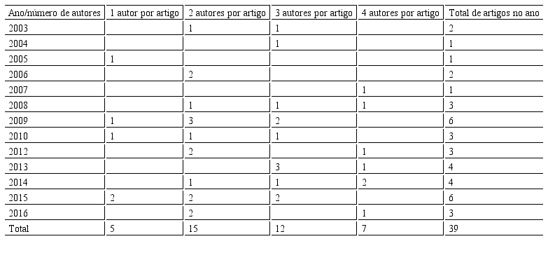 A tabela 2 mostra a distribuição dos artigos por número de autores. A partir dela, é possível afirmar que há a predominância de publicações com dois autores por artigo – 38,5% do total da amostra –, seguidos de três autores por artigo, que representa 30,8% do total da amostra. Nesse sentido, constatou-se também o baixo número de publicações individuais quando comparado às publicações em conjunto.