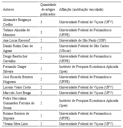 Quanto à autoria, destacaram-se Alexandre Bragança Coelho, da Universidade Federal de Viçosa (UFV) e Tatiane Almeida de Menezes, da Universidade Federal do Pernambuco (UFPE), ambos com três publicações sobre a temática. Notou-se, também, que a maioria dos autores que publicam sobre as POF estão vinculados a Universidade de São Paulo (USP), seguidos pela Universidade Federal de Pernambuco (UFPE) e pela Universidade Federal de Viçosa (UFV), demonstrando a possibilidade de um futuro fortalecimento de grupos de pesquisa sobre a temática nessas instituições.