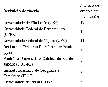 Os artigos que compõem esta análise também foram distribuídos de acordo com as instituições de origem dos seus autores e coautores. Para tanto, foram realçadas aquelas que tiveram 5 ou mais autores vinculados à instituição. Como é possível verificar na tabela 4, houve um maior número de autores e coautores nas publicações sobre as POF vinculados à Universidade de São Paulo (USP), com 17 autores no total, seguidos pela Universidade Federal de Pernambuco (UFPE), com 12, e pela Universidade Federal de Viçosa (UFV), com 11 autores em publicações.