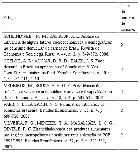 Outro aspecto relevante de se destacar sobre a Tabela 5 é que as obras mais citadas sobre as POF levam em consideração informações relacionadas com os domicílios, as famílias e as estruturas orçamentárias da população brasileira (DINIZ et al., 2007), sendo amplamente citadas e divulgadas em periódicos da área da Economia, como apontado por Silva, Parente e Kato (2009), mas pouco frequentes na área da Administração (SILVA, 2004).