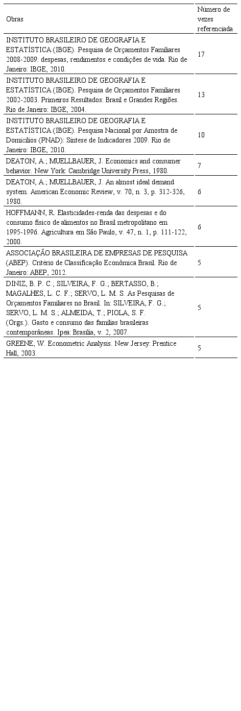 Constatou-se que a principal obra referenciada nessa temática é a Pesquisa de Orçamentos Familiares realizada pelo IBGE nos anos de 2008/2009, seguida pela POF de 2002/2003, referenciadas 17 e 13 vezes, respectivamente. Tal fato pode ser explicado pois, segundo o IBGE (2010), a última POF, realizada em 2008/2009 e publicada em 2010, foi a mais abrangente e sistemática realizada até o momento. Além disso, é importante ressaltar que as POF de 1987/1988 e 1995/1996 também foram referenciadas nos artigos analisados, sem, contudo, atingir o critério de aparecer cinco vezes ou mais como referência e, por isso, ambas não compuseram a Tabela 6.
