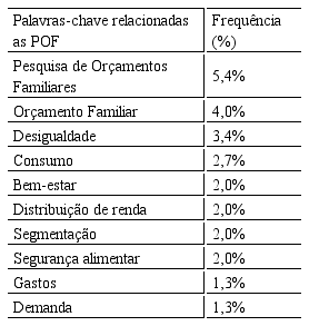 De modo geral, considerando essa inconsistência na frequência de palavras-chave nos artigos analisados – tendo em vista que poucos termos se repetiram algumas vezes – pode-se afirmar que ainda não há muitas temáticas consolidadas que se relacionam com as POF e que a Lei de Zipf também não se aplicada nesse contexto, já que ela se refere ao princípio do mínimo esforço, em que haveria pouca dispersão dos principais termos citados no texto (VANTI, 2002). Por outro lado, tal fato demonstra também que as POF realmente contem um vasto campo de informações relevantes sobre a população brasileira e que, portanto, trata-se de um instrumento em potencial para utilização de seus resultados nas pesquisas nacionais (DINIZ et al., 2007).