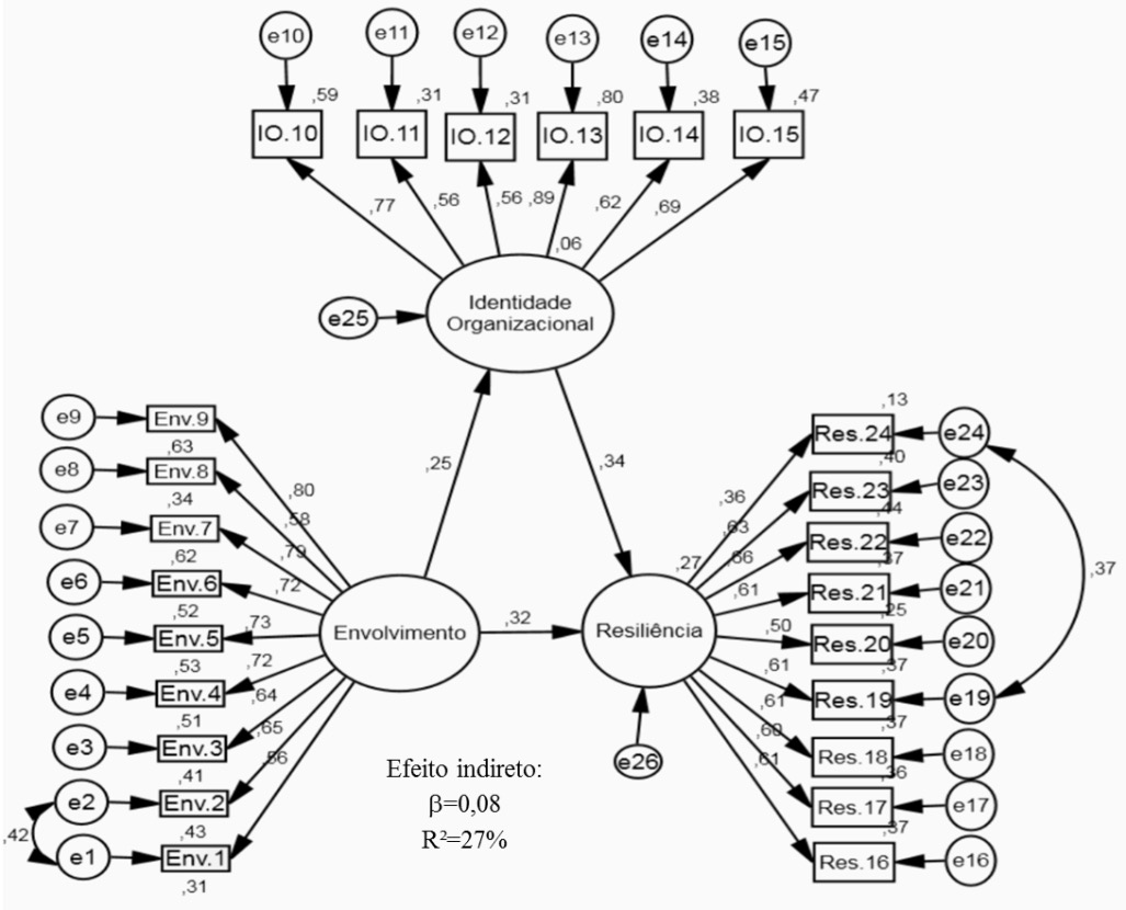 Além de testar as relações diretas, o efeito indireto do Envolvimento sobre a Resiliência no Trabalho foi calculado e também está mostrado na Figura 1. A mediação parcial foi confirmada e o efeito indireto foi significativo (p-valor<0,00) e estimado em 0,08. O coeficiente de regressão R² foi de 27%, ou seja, o Envolvimento e a Identidade Organizacional explicam 27% da variável dependente, a Resiliência no Trabalho. Essa explicação é considerada de grande efeito, pois foi maior que 26% (Cohen, 1992). Nota-se, por fim, que os índices de ajuste do modelo foram adequados (CMIN/DF=1,43; CFI=0,91; SRMR=0,07) confirmando o modelo de mediação hipotetizado na presente pesquisa.