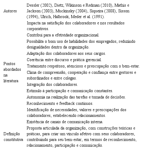 Em consonância com a acepção de prática de envolvimento utilizada na presente pesquisa, a Tabela 1 apresenta seus principais autores, pontos abordados na literatura e as respectivas definições constitutivas, que é o tipo mais comum em termos de dicionários e teorias (Pasquali, 2010).