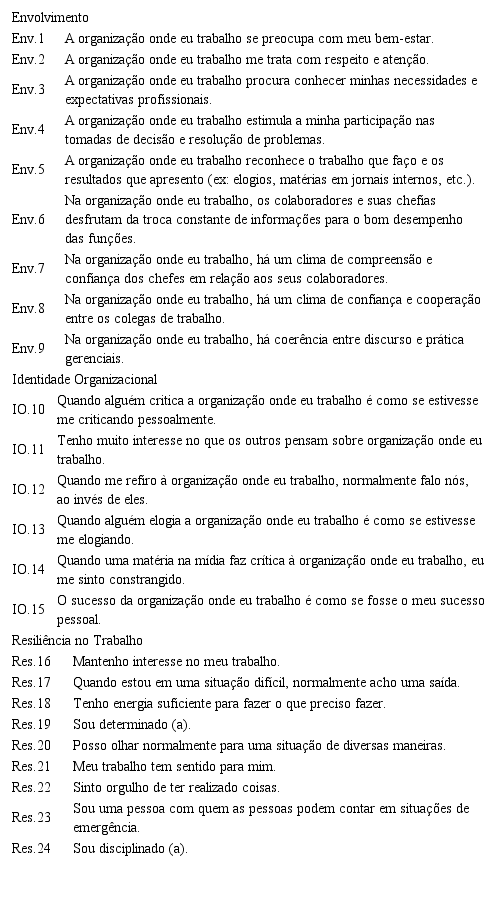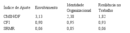 Em um primeiro momento, a fim de verificar o ajuste dos modelos de mensuração, a AFC foi realizada com cada variável da pesquisa, Envolvimento, Identidade Organizacional e Resiliência no Trabalho. A estrutura unifatorial da variável latente Envolvimento (9 itens) foi confirmada, assim como a estrutura da Identidade Organizacional (9 itens) e a da Resiliência no Trabalho (6 itens), conforme Tabela 2. Todos os 24 itens foram significativos (p-valor<0,01).