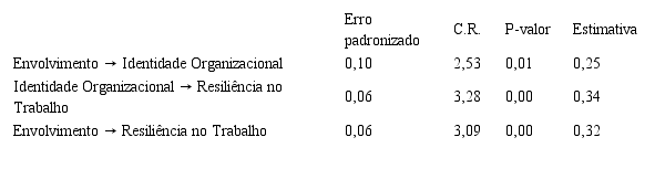 Em seguida, para atingir o objetivo da presente pesquisa, o modelo de caminhos foi construído para testar se a variável Identidade Organizacional medeia a relação entre o Envolvimento e a Resiliência no Trabalho. Em consonância com Baron e Kenny (1986), as relações entre as três variáveis foram testadas. Ou seja, verificou-se a relação direta entre: a) Envolvimento e Resiliência no Trabalho; b) Identidade Organizacional e Resiliência no Trabalho e; c) Envolvimento e Identidade Organizacional. Todas elas foram significativas (p-valor<0,01).