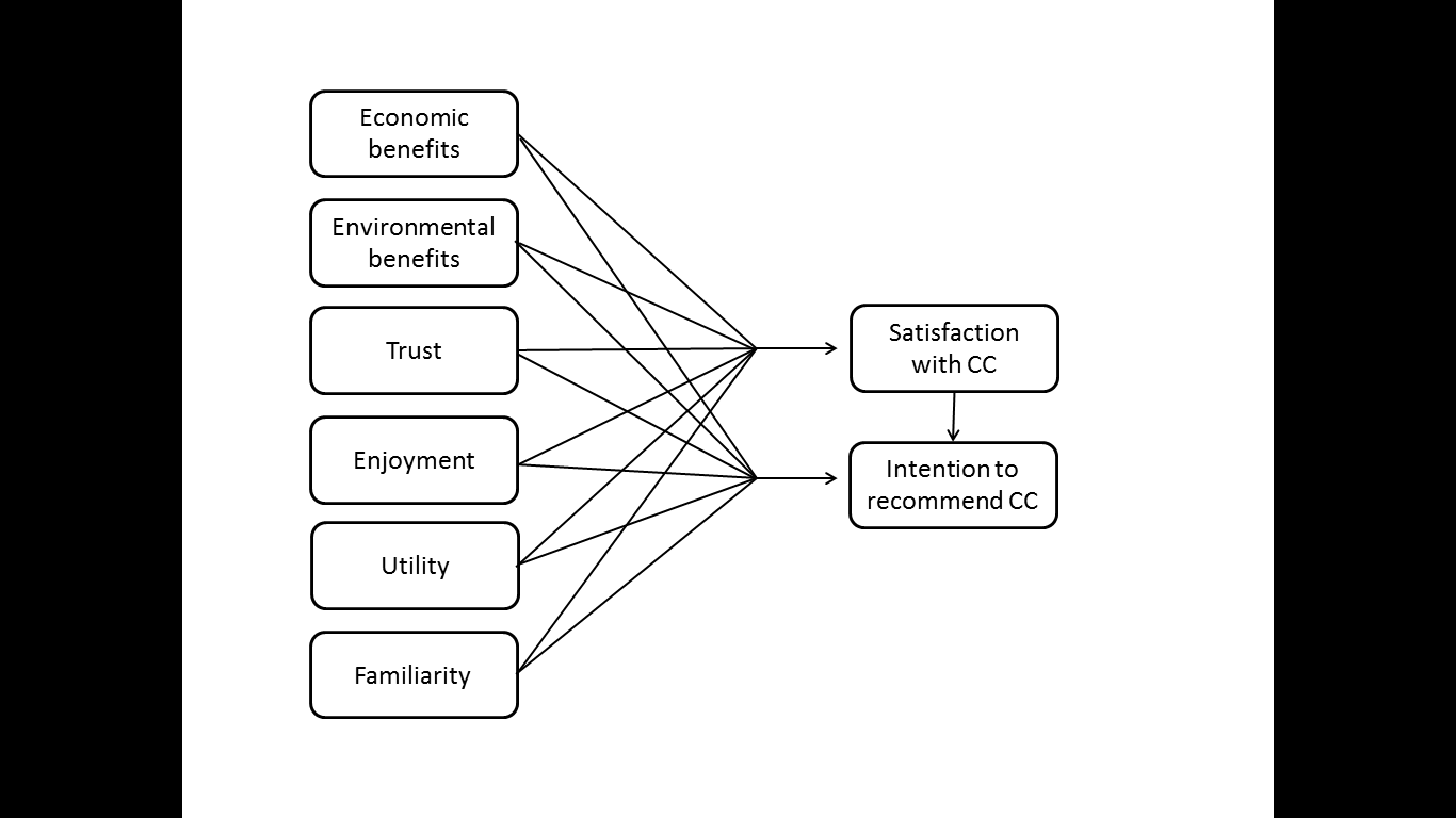Our research model (Figure 1) illustrates the determinants of satisfaction and intention to recommend CC. We propose six possible and distinguishable categories in which the forthcoming hypotheses are developed, namely economic benefits, environmental benefits, trust, enjoyment, utility, and familiarity.