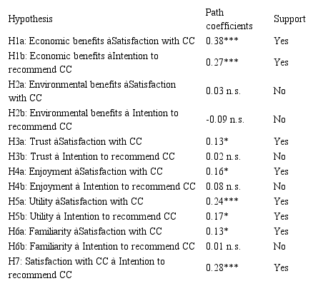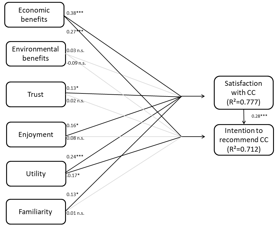 The authors (2018)In support of hypotheses 1a and 1b, the data reveals economic benefits to have a positive and significant effect on the satisfaction with CC (.38***) and intention to recommend CC (.27***). Hypotheses 2a and 2b are rejected because it did not receive statistical support from the data. A significant path coefficient was estimated from trust on the satisfaction with CC (.13*) in line with hypothesis 3a, but hypothesis 3b was not confirmed by the data.