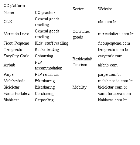 Many CC practices are evidenced in Brazilian context. The examples span the sectors of consumer goods (general goods reselling, kids’ stuff reselling and books lending), residential/tourism (cohousing and P2P accommodations) and transport (P2P rental car, bikesharing, carsharing and carpooling) (Table 1). These CC practices were chosen because they are recurrently mentioned in studies about collaborative consumption and sharing economy but this compilation does not present an exhaustive list of existing practices in Brazil.