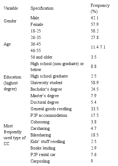 Over half of the sample was female (57.9%). The majority of the sample was composed of university students aged between 18 and 25 years. If the respondent consumes more than on type of CC, he/she should choose the preferred collaborative product or service. General goods reselling is the most frequently type of CC used by the respondents (33.5%).
