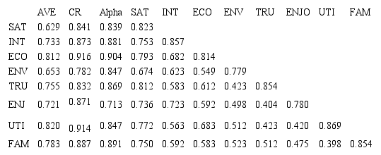 The construct Enjoyment had a slightly smaller alpha than recommended; however, the other validity metrics were good and the lower alpha is not likely to point to a validity issue. The construct passed all of the validity and reliability tests. Discriminant validity was first assessed by a comparison of the square root of the AVE of each construct to all correlations between it and other constructs, where all of the square roots of the AVEs should be greater than any of the correlations between the corresponding construct and another construct (CHIN, 1998).