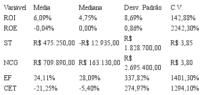 A variável ROE apresentou desvio-padrão muito próximo de zero, os dados das empresas analisadas encontram-se todos muito próximos da média, resultando em pouca dispersão, o que confirma um resultado desfavorável para os investidores.