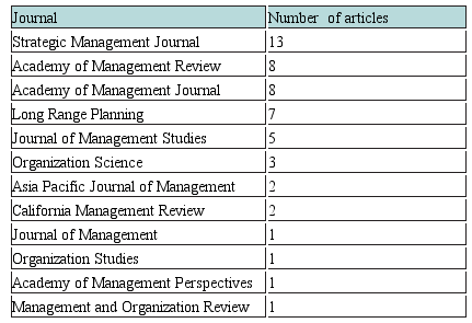 During the second year of the survey, the same research methodology and categorization of articles were applied to the field of organizational theory. The same criteria were used, and of the 1,328 articles initially found, only 52 were added to the group analyzed the previous year. A complete list of the articles organized by journal is shown in Table 2.