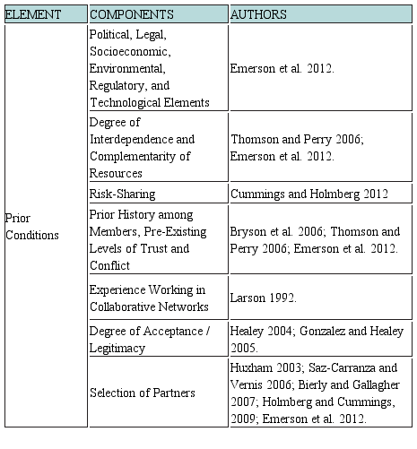 In studies that focus on prior conditions, the discussion addresses the elements that influence the establishment of the network, such as the political and regulatory aspects. These studies also include debates about actors' perception of their level of interdependence, complementarity of resources, and risk-sharing. They can also include the prior history among members, pre-existing levels of trust and conflict, and other factors. Table 3 shows these elements and others discussed by the authors.