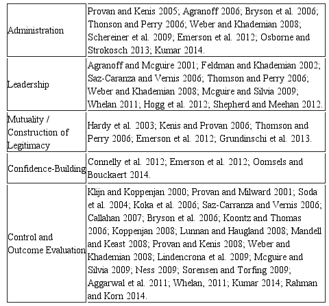 In addition to the contractual aspect, there is procedural governance, which includes the various processes and instruments by which the network's day-to-day operations are managed. Among those discussed in the literature, several are highlighted here: the process establishing how communication occurs aims to provide informational symmetry, restricting opportunistic behavior (BRYSON et al., 2006; THOMSON and PERRY, 2006; SCHEREINER et al., 2009; WHELAN, 2011); management of the conflicts that occur in any network composed of multiple actors with different world views and different cultures (BRYSON et al., 2006; THOMSON and PERRY, 2006; WHELAN, 2011); the evolution of objectives, which may have coincided when the network was established but may require renegotiation as the network matures and the context changes (KALE, 2006; KOPPENJAN, 2008; MANDELL and KEAST, 2008; KLIJN and KOPPENJAN, 2009; MCGUIRE and SILVIA, 2009;KUMAR, 2014); and the decision-making process, which may not require unanimity but should favor consensus and balance in the exercise of authority, as the actors have different degrees of power and status (AGRANOFF, 2006;EMERSON et al., 2012); in this sense, it should favor balance and seek to establish horizontal relationships among the partners (PROVAN and KENIS, 2005).