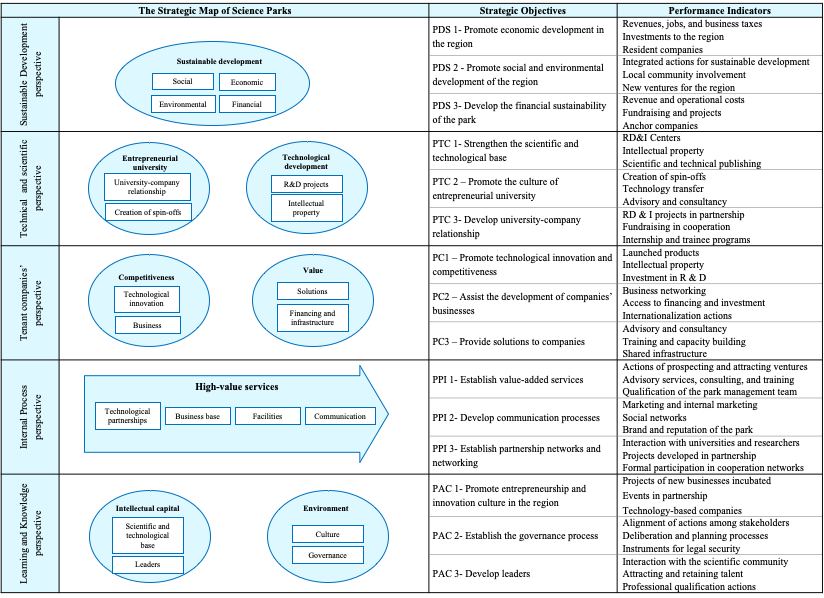 From the definition of perspectives, as shown in Table 5, and considering their relationship with critical success factors (Table 2), high value-added services (Table 3) and results indicators (Table 4), it was proposed the performance management model of science parks in Figure 1. The management model integrates performance perspectives, strategic goals and performance indicators in a strategic map and a BSC for science parks.