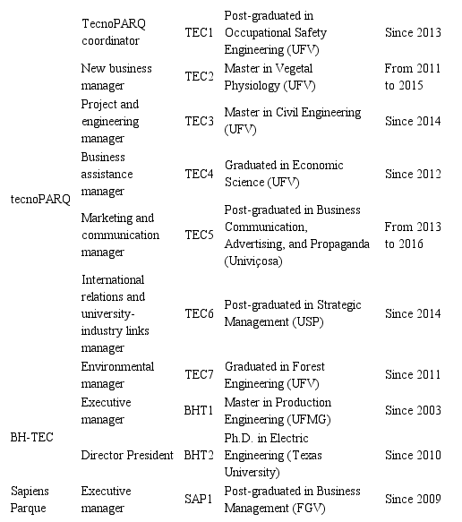 The interviews took place at each science park researched, after a formal contact presenting the study, its objectives and the roadmap of semi-structured questions (Table 1). As well as the interviews, secondary data were collected through direct observation and institutional documents. This triangulation increased the internal validity of the research findings.