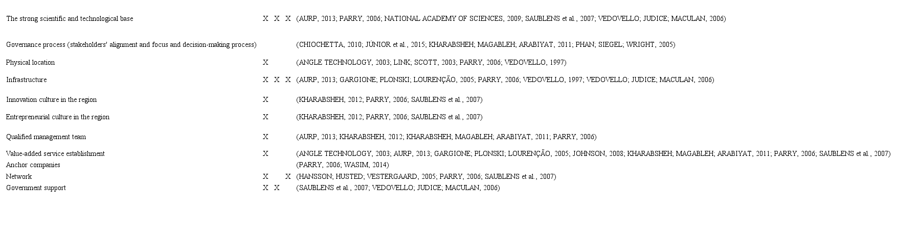 By analyzing the literature, other factors may be considered for the success of a science park, such as governance (BIGLIARDI et al., 2006; CHIOCHETTA, 2010; JÚNIOR; PORTO; PACÍFICO; JÚNIOR, 2015; KHARABSHEH, 2012; KHARABSHEH; MAGABLEH; ARABIYAT, 2011; PHAN; SIEGEL; WRIGHT, 2005); geographic location (LINK; SCOTT, 2003; VEDOVELLO, 1997); infrastructure (GARGIONE; PLONSKI; LOURENÇÃO, 2005; VEDOVELLO; JUDICE; MACULAN, 2006); innovation capacity and entrepreneurial culture in the region (SAUBLENS, 2007; KHARABSHEH, 2012); qualified management team (KHARABSHEH, 2012; KHARABSHEH; MAGABLEH; ARABIYAT, 2011); presence of anchor company (WASIM, 2014); network for learning (HANSSON; HUSTED; VESTERGAARD, 2005).