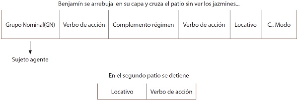 En el texto predominan los verbos de acción y de proceso. En gran parte del texto, Benjamín es perfilado como experimentante (v. gr., “le deslumbra”, “advierte”, “no sabe cómo proceder”). Por otro lado, abundan los locativos (v. gr., “...avivando aquí un pabilo, enderezando allá un taburete”, “Los muebles del corredor han sido trasladados al corredor de alero”) y los complementos temporales (v. gr., “Todo ha terminado ya”, “Durante diez días, la loca no paró con las invitaciones”, “Ahora no vale la pena”).