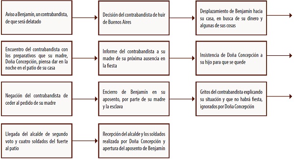 Benjamín, un contrabandista es informado por un negro que ha venido de Mendoza de que será delatado y decide viajar desde Buenos Aires, donde vive, hacia el norte. Se dirige a su casa para preparar la partida. Cuando llega al patio ve los preparativos de una fiesta que su madre, Doña Concepción, pretende realizar en la noche. Al verlo llegar, la mujer recibe a su hijo y se entera de que piensa marcharse; pero insiste desesperadamente en que no lo haga. Debido a que Benjamín persiste en su idea, lo encierra en su aposento, colocando en la salida de este un sillón, con ayuda de su esclava. Las mujeres continúan con los preparativos de la fiesta, sin hacer caso a los gritos del contrabandista, que confiesa que vendrán a prenderlo y que no ha enviado las invitaciones de la fiesta. Al poco tiempo llega el alcalde de segundo voto con cuatro soldados del fuerte y Doña Concepción los acoge creyendo que vienen a la fiesta. Con ayuda de la mulata, corre el sillón que traba la salida a Benjamín, para que este los reciba.