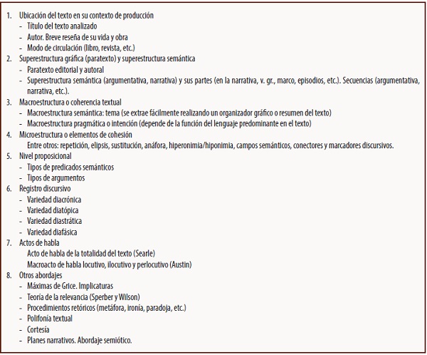 Los aspectos que se tienen en consideración son los siguientes: superestructura gráfica, superestructura semántica, macroestructura pragmática, microestructura, nivel proposicional, registro, actos de habla, explicaturas, implicaturas, procedimientos retóricos, estrategias de cortesía y polifonía.