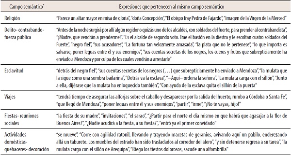 En este apartado se presentan algunas categorías presentes en el texto a nivel local. La primera de ellas es la analogía, cuyo ejemplo seleccionado es el siguiente: “Abre las manos, como si sintiera fluir la plata que no le pertenece”5. Hay también descripciones; por ejemplo, “Los muebles del estrado han sido trasladados al corredor de alero...”. Además, se encuentran paráfrasis (v. gr., “¿Le dirá también que no habrá tal fiesta, que nadie asistirá al patio luminoso?”; “...tarde a tarde fue postergando la explicación, el pretexto”) y enumeraciones (v. gr., “El obispo fray Pedro de Fajardo, los señores del cabildo, los vecinos de fuste...”).