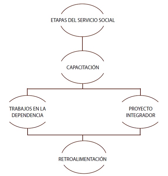 La estructura del programa se compone de las dimensiones laboral y académica, las cuales se vinculan por el proyecto integrador. Por medio de este proyecto, el estudiantado debe detectar una problemática a mejorar y proponer una solución en el área donde realiza su servicio social. Lo anterior lo realiza con la tutoría de un maestro o maestra quien revisa los avances de dicho proyecto.