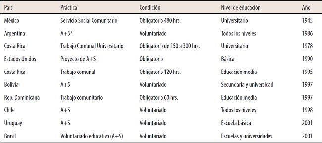 De acuerdo con Dubain (2011, p. 70, citando a Dubain y Ojeda, 2007), se presenta la Tabla 1 en la cual se resumen las prácticas de servicio social o comunitario en distintos países de América. Se especifica en dicha tabla el tipo de práctica que se realiza, la condición, es decir, si es obligatorio o voluntario; el nivel de educación en que se practica y el año a partir del cual se ejercen estas actividades.