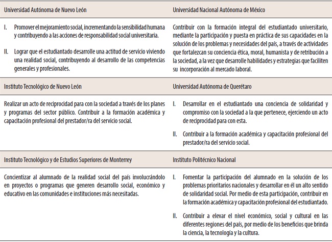 Es interesante observar que los objetivos de las IES, mencionados en la tabla 2, coinciden en que mediante del Servicio Social se busca la formación académica, capacitación profesional y formación integral del estudiantado. Lo anterior es indicativo de que se percibe este programa como un medio para la formación de competencias en el alumnado.