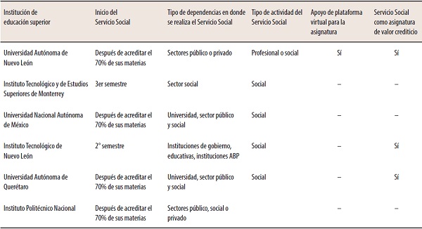 El Servicio Social, por ley, consiste en el ejercicio de 480 horas en un “trabajo de carácter temporal y mediante retribución que ejecuten y presten los profesionistas y estudiantes en interés de la sociedad y el Estado” (Congreso de los Estados Unidos Mexicanos, 1945, artículo 53, p. 9). Partiendo de esta legislación, cada IES gestiona el modo en que se ejecuta la prestación del Servicio Social (ver Tabla 3). De esta manera, algunas instituciones permiten el inicio del periodo del servicio social en los primeros semestres de las carreras, mientras que otras lo hacen después de que sus estudiantes hayan acreditado el 70% de sus materias. Por otro lado, algunas universidades establecen que el ejercicio del Servicio Social sea en el sector público, social o privado, así como que el tipo de actividad sea profesional o exclusivamente social. Por último, algunas IES han desarrollado alguna plataforma virtual de apoyo para el estudianado que realiza su servicio social y otras han asignado un valor en créditos a dicho ejercicio.